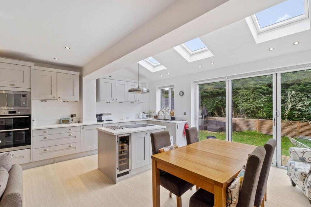 I think you’ll really like this one. Tucked away on Georges Crescent, this three-bed semi has a stunning extended kitchen and dining space with underfloor heating and bi-fold doors to the garden. There’s a private garden, a driveway for four cars, and no onward chain. It’s on the market for £375,000.