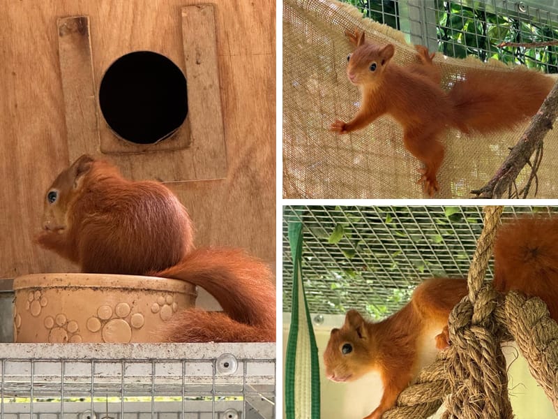 Three baby red squirrels (known as kittens), were spotted poking their heads out and having a nosey around their enclosure for the first time.